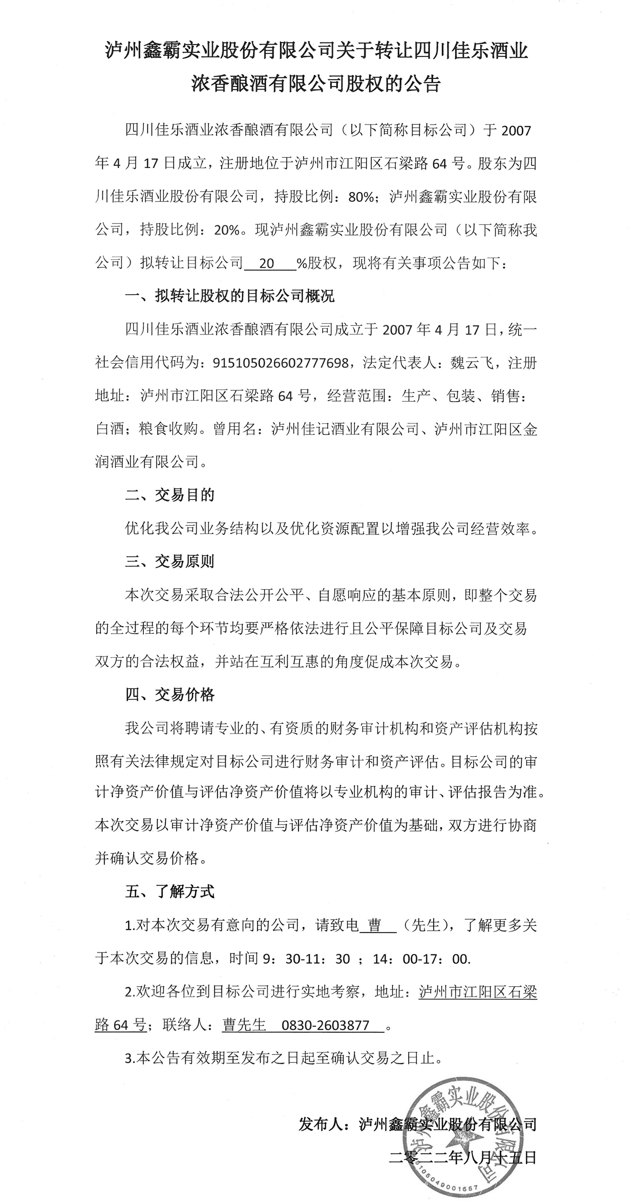 瀘州鑫霸實業(yè)股份有限公司關于轉讓四川佳樂酒業(yè)濃香釀酒有限公司股權的公告